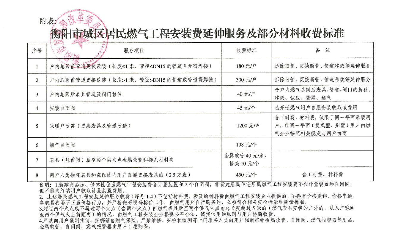 根據衡陽市發展和改革委員會《關于規范市中心城區燃氣工程安裝收費有關事項的通知》(衡發改價商〔20242號)文件規定: