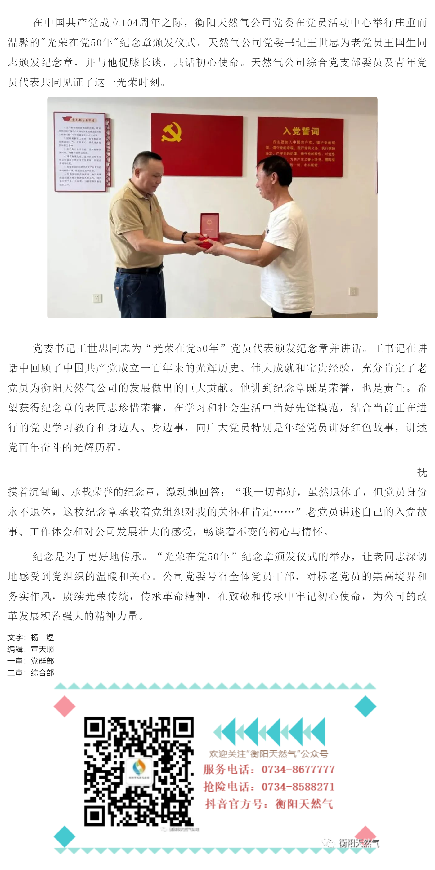賡續(xù)紅色血脈+永葆黨員本色天然氣公司黨委舉行光榮在黨50年紀(jì)念章頒發(fā)儀式